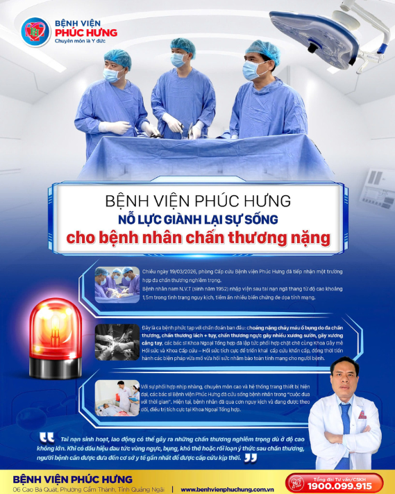 Chiều ngày 19/03/2026, phòng Cấp cứu Bệnh viện Phúc Hưng đã tiếp nhận một trường hợp đa chấn thương nghiêm trọng. Bệnh nhân nam N.V.T (sinh năm 1952) nhập viện sau tai nạn ngã thang từ độ cao 1,5m trong tình trạng nguy kịch, tiềm ẩn nhiều biến chứng đe dọa tính mạng