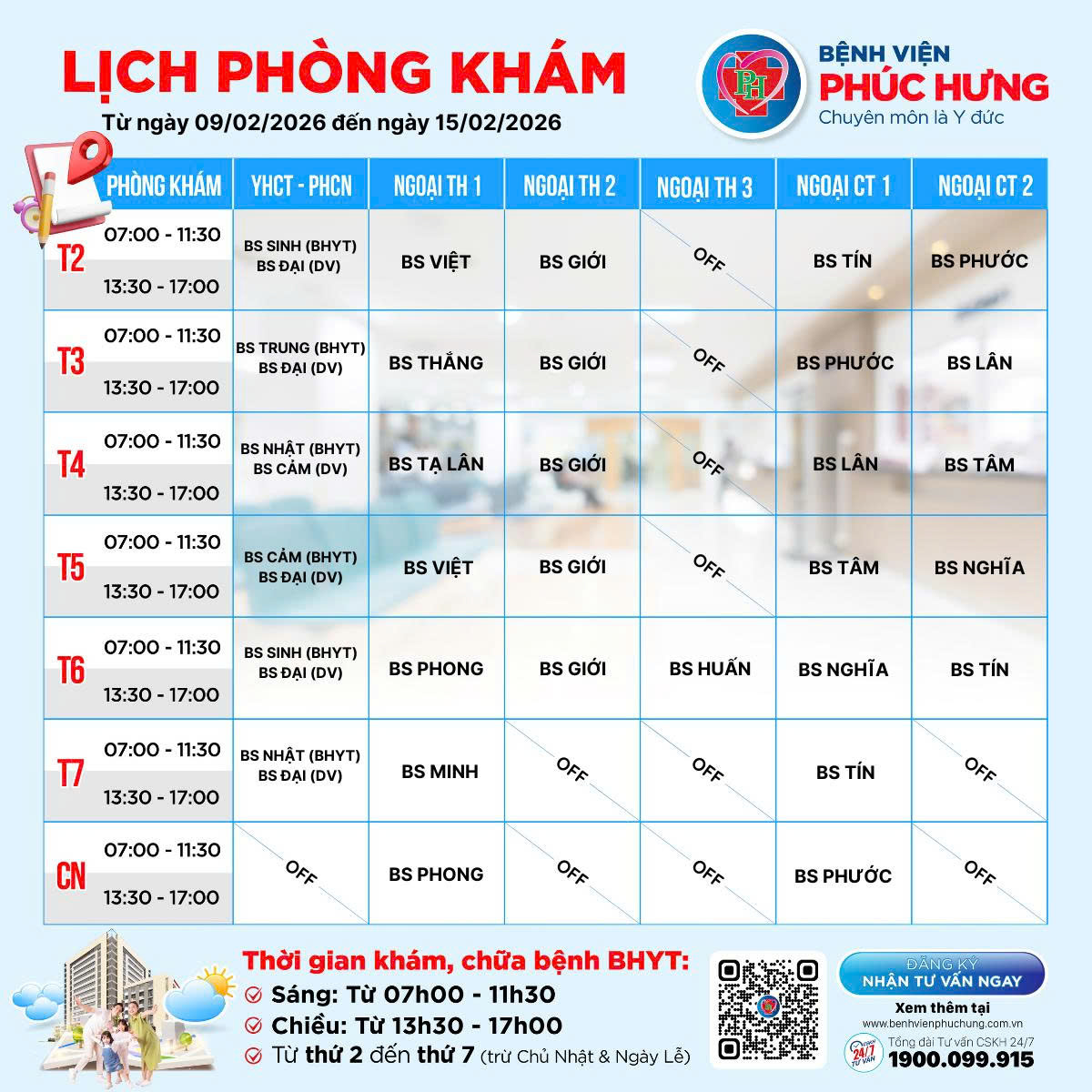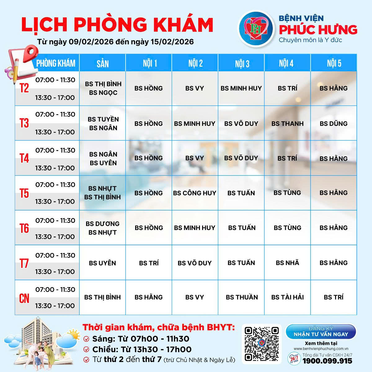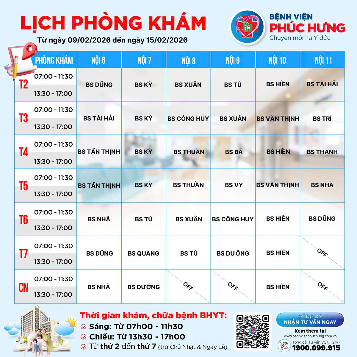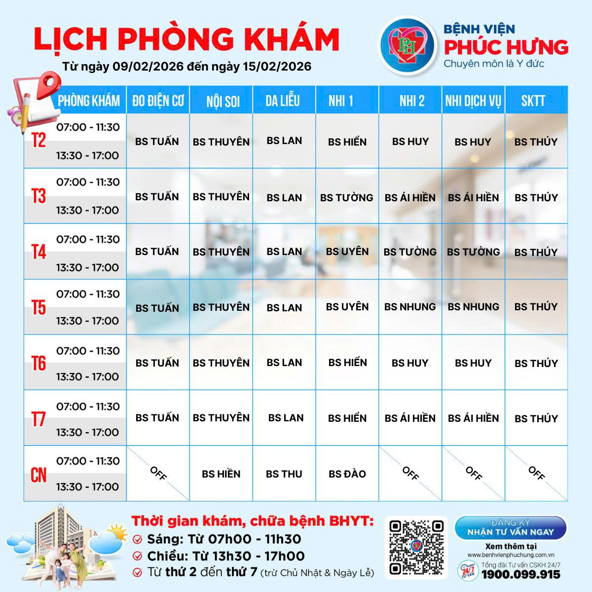 LỊCH PHÒNG KHÁM | 09/02 - 15/02