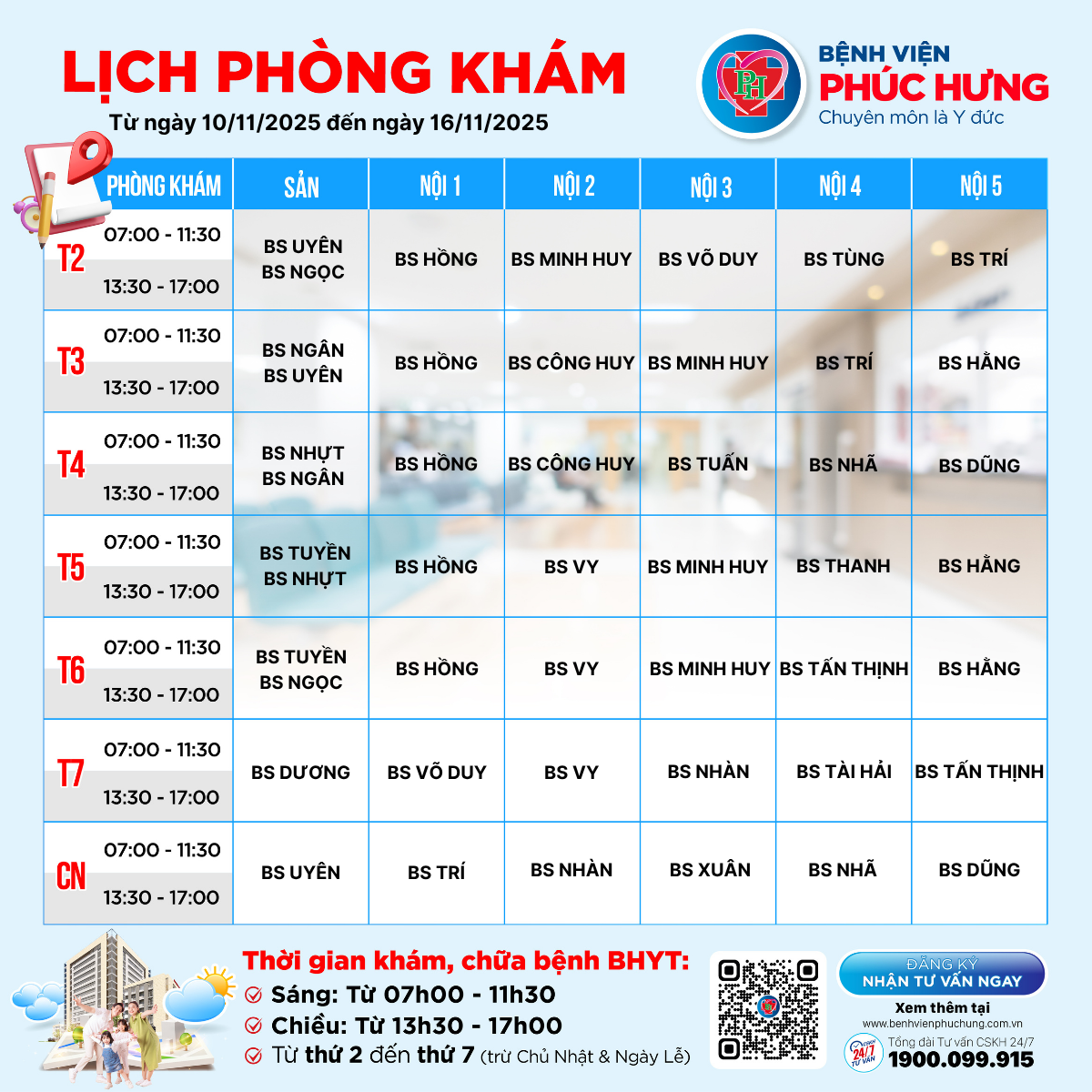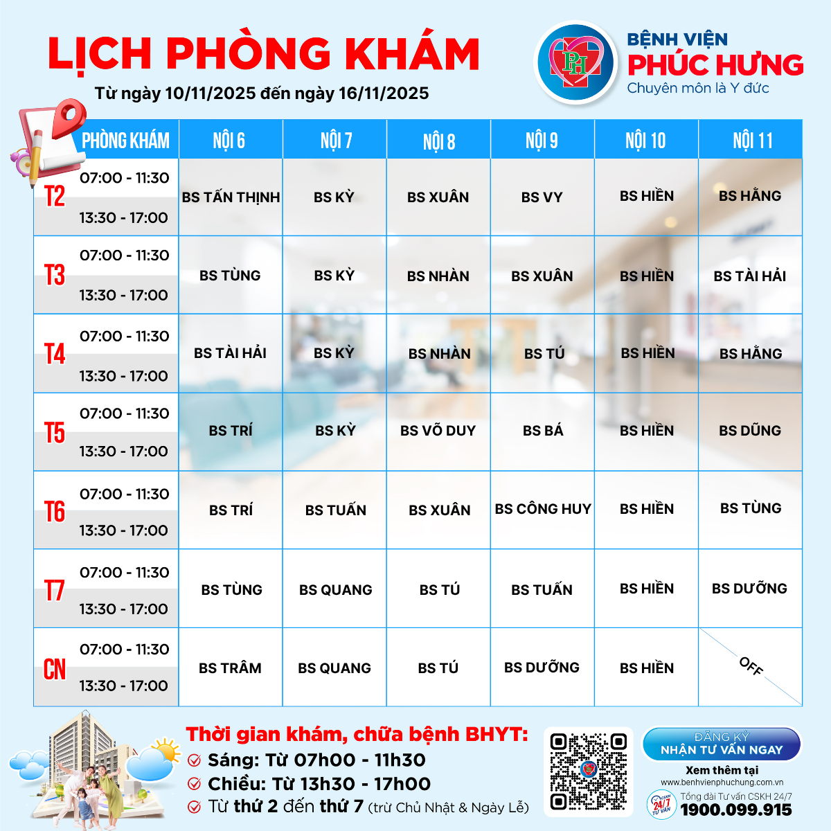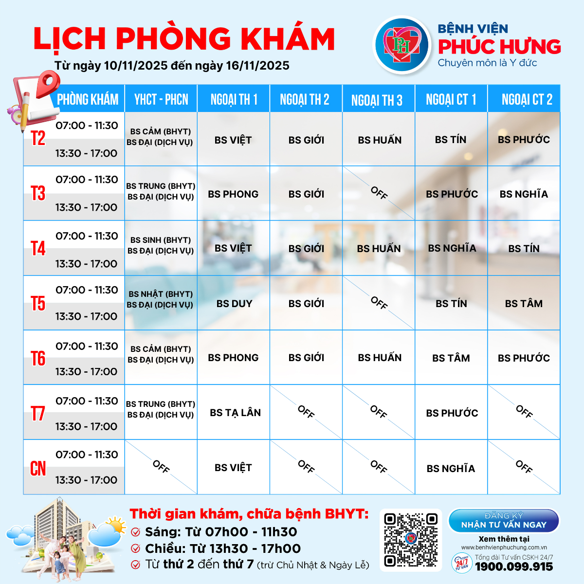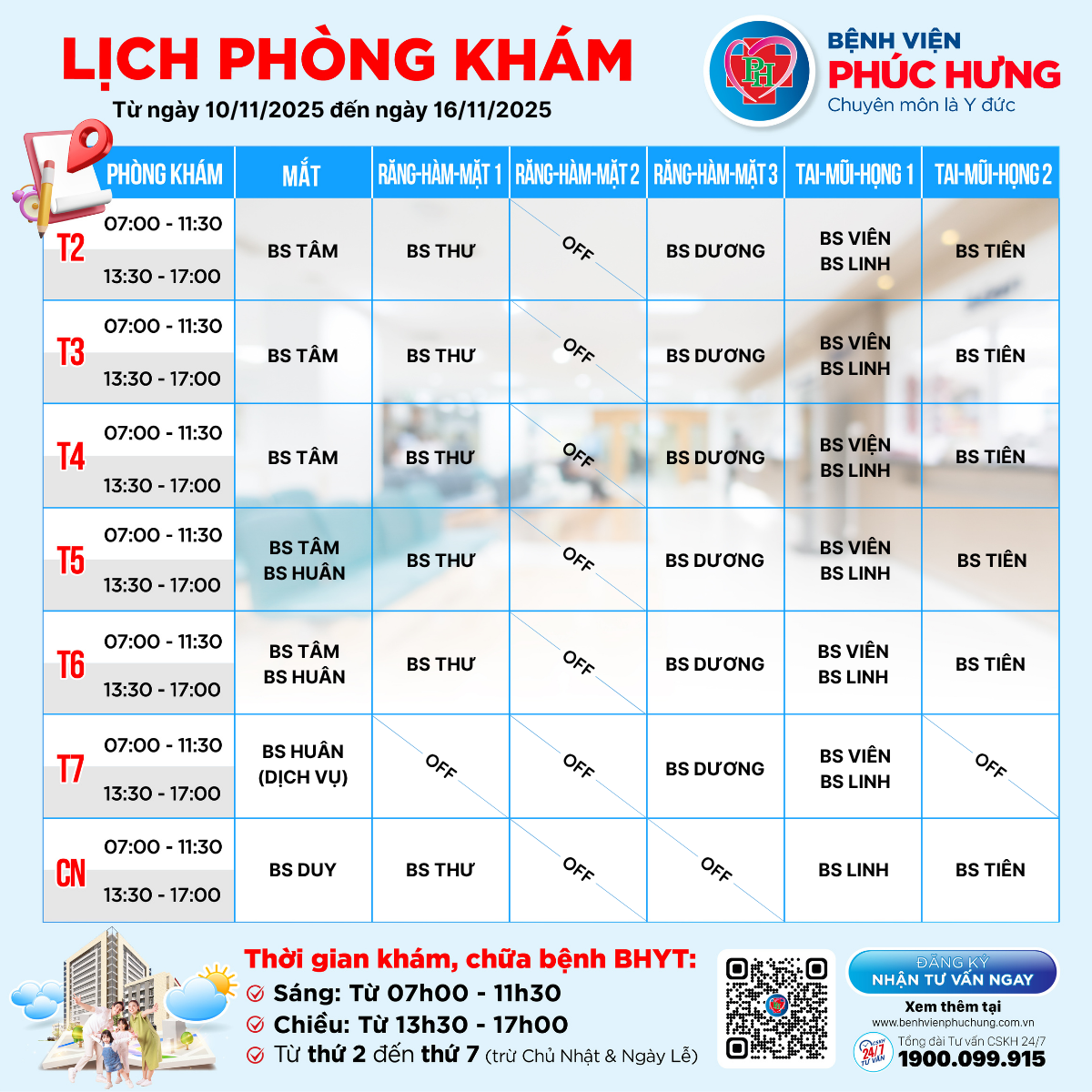 LỊCH PHÒNG KHÁM TỪ 10/11-16/11