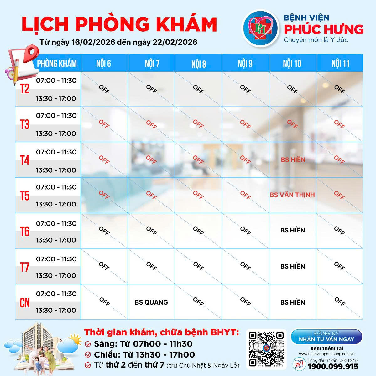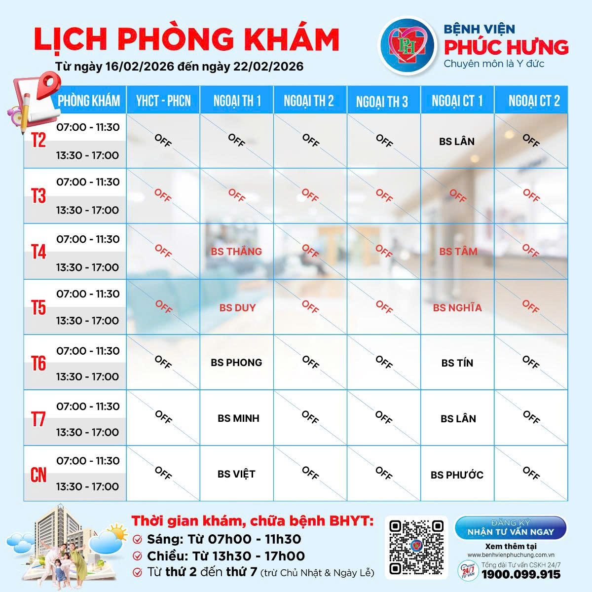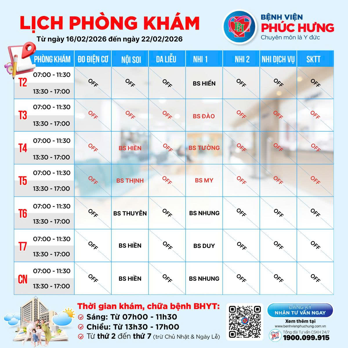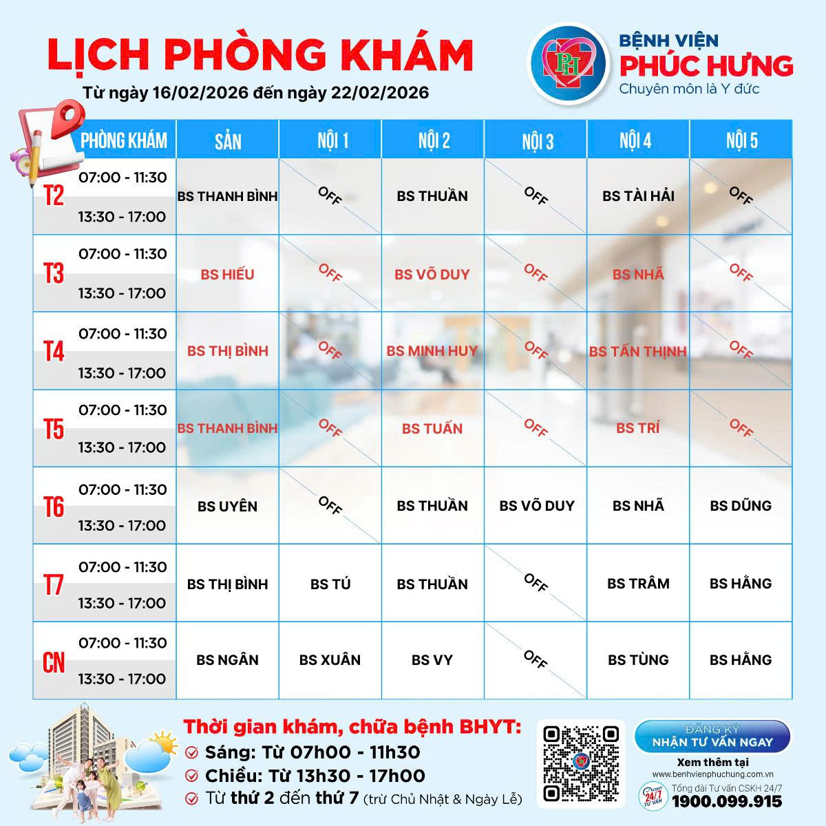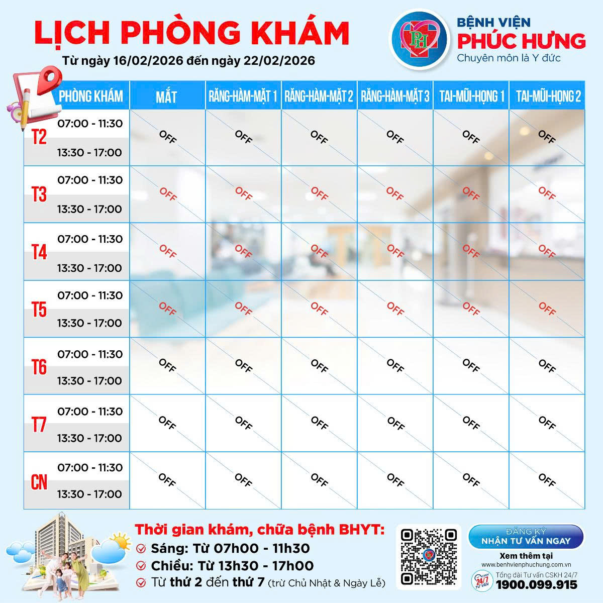 LỊCH PHÒNG KHÁM | 16/02 - 22/02
