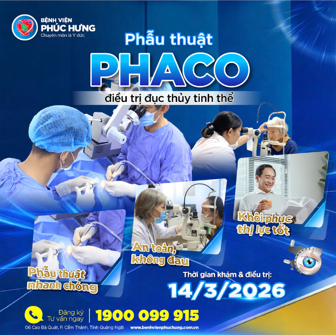 Nhằm mang đến cơ hội điều trị đục thủy tinh thể bằng kỹ thuật hiện đại cho người dân tại Quảng Ngãi và khu vực lân cận, Bệnh viện Phúc Hưng phối hợp cùng đoàn chuyên gia nhãn khoa đến từ Bệnh viện Mắt TP.HCM trực tiếp thăm khám và thực hiện phẫu thuật Phaco cho người bệnh.