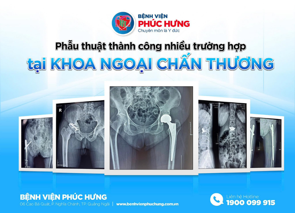 Trong thời gian qua, Khoa Ngoại Chấn Thương – Bệnh viện Phúc Hưng đã liên tục tiếp nhận và điều trị thành công nhiều trường hợp chấn thương nặng, phức tạp như gãy cổ xương đùi, thay khớp háng toàn phần, chấn thương cột sống, gãy xương chi dưới và chấn thương vùng chậu.