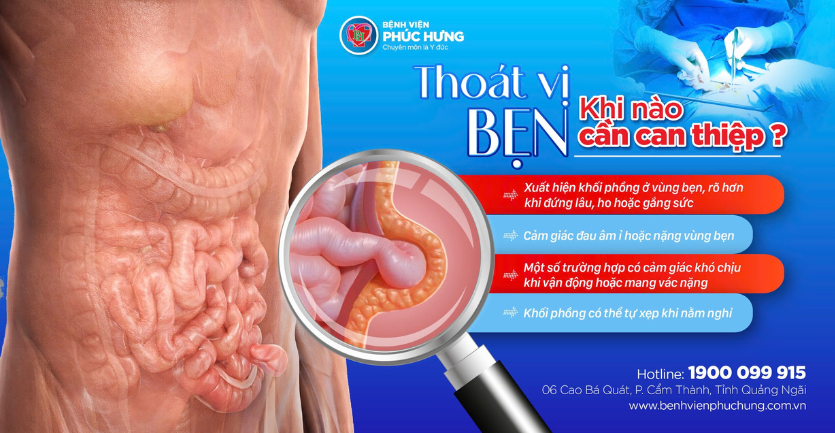Đặc biệt: khi có biểu hiện đau dữ dội, buồn nôn, nôn hoặc khối thoát vị không xẹp khi nằm nghỉ, người bệnh cần đến cơ sở y tế ngay để được xử trí kịp thời.