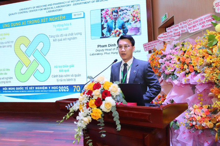 Hội nghị dưới sự chủ trì Lãnh đạo Bộ Y tế, Cục Quản lý Khám chữa bệnh, Đại học Y Dược TP.HCM; Trung tâm Kiểm chuẩn chất lượng xét nghiệm y học - Đại học Y Dược TP.HCM quy tụ các chuyên gia đầu Ngành trong nước cùng nhiều báo cáo viên quốc tế đến từ Hàn Quốc, Thái Lan. ThS. Phạm Đình Vũ trình bày đề tài: “Ứng dụng trí tuệ nhân tạo trong phát hiện DRIFT và sai số: Phân tích dữ liệu nội kiểm và ngoại kiểm”