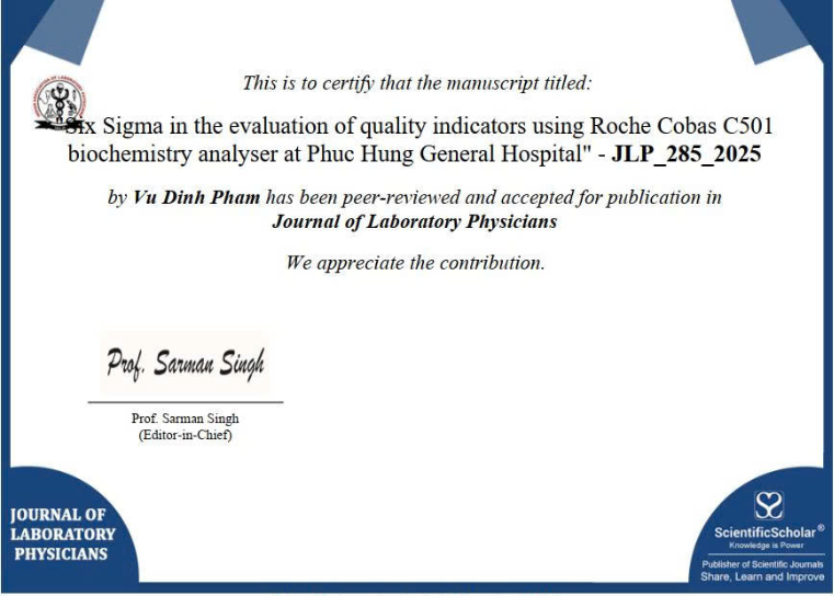 Thạc sĩ Phạm Đình Vũ đã đăng bài báo Quốc tế trên Tạp chí Journal of Laboratory Physicians (JLP) - tạp chí chuyên ngành Xét nghiệm thuộc Hệ thống ESCI/WoS, Q3, IF 1.1.