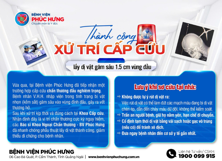 Vừa qua – Khoa Cấp cứu và Khoa Ngoại Chấn thương Bệnh viện Phúc Hưng vừa tiếp nhận và xử trí thành công một trường hợp chấn thương đầu nguy kịch, khi bệnh nhân V.H.H. được đưa vào viện với một dị vật kim loại sắc nhọn găm sâu vào vùng đỉnh đầu, tạo vết thương hở và tiềm ẩn nhiều rủi ro đe dọa tính mạng.