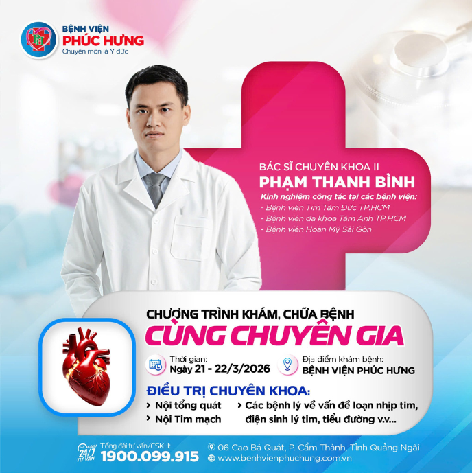Trong 2 ngày 21–22/03/2026, BSCKI Phạm Thanh Bình – bác sĩ Tim mạch giàu kinh nghiệm sẽ trực tiếp thăm khám và tư vấn tại Bệnh viện Phúc Hưng.