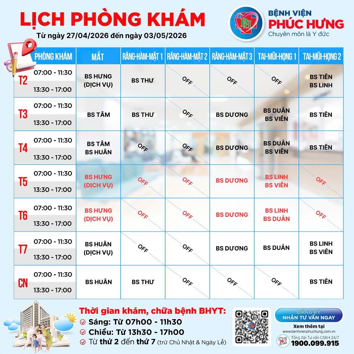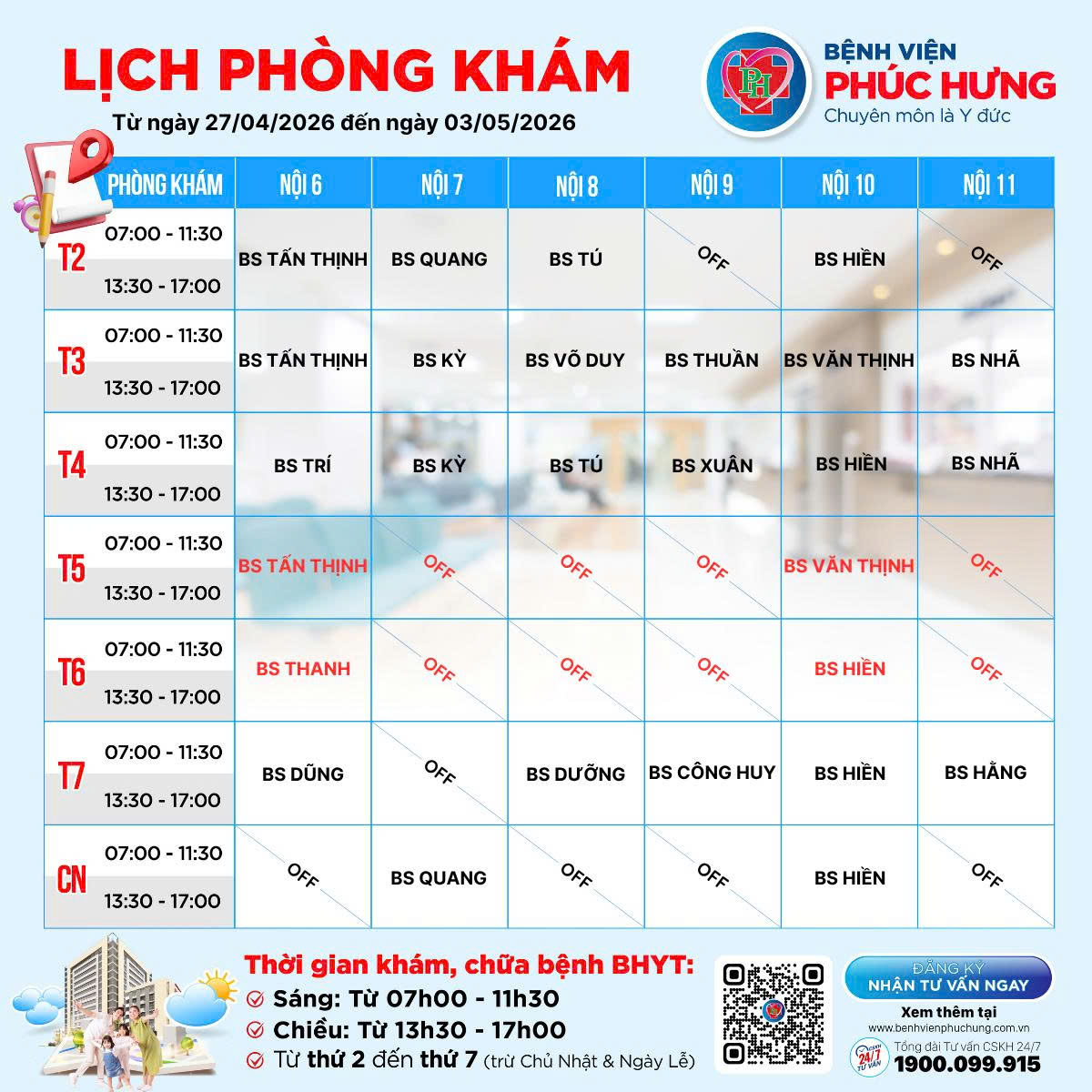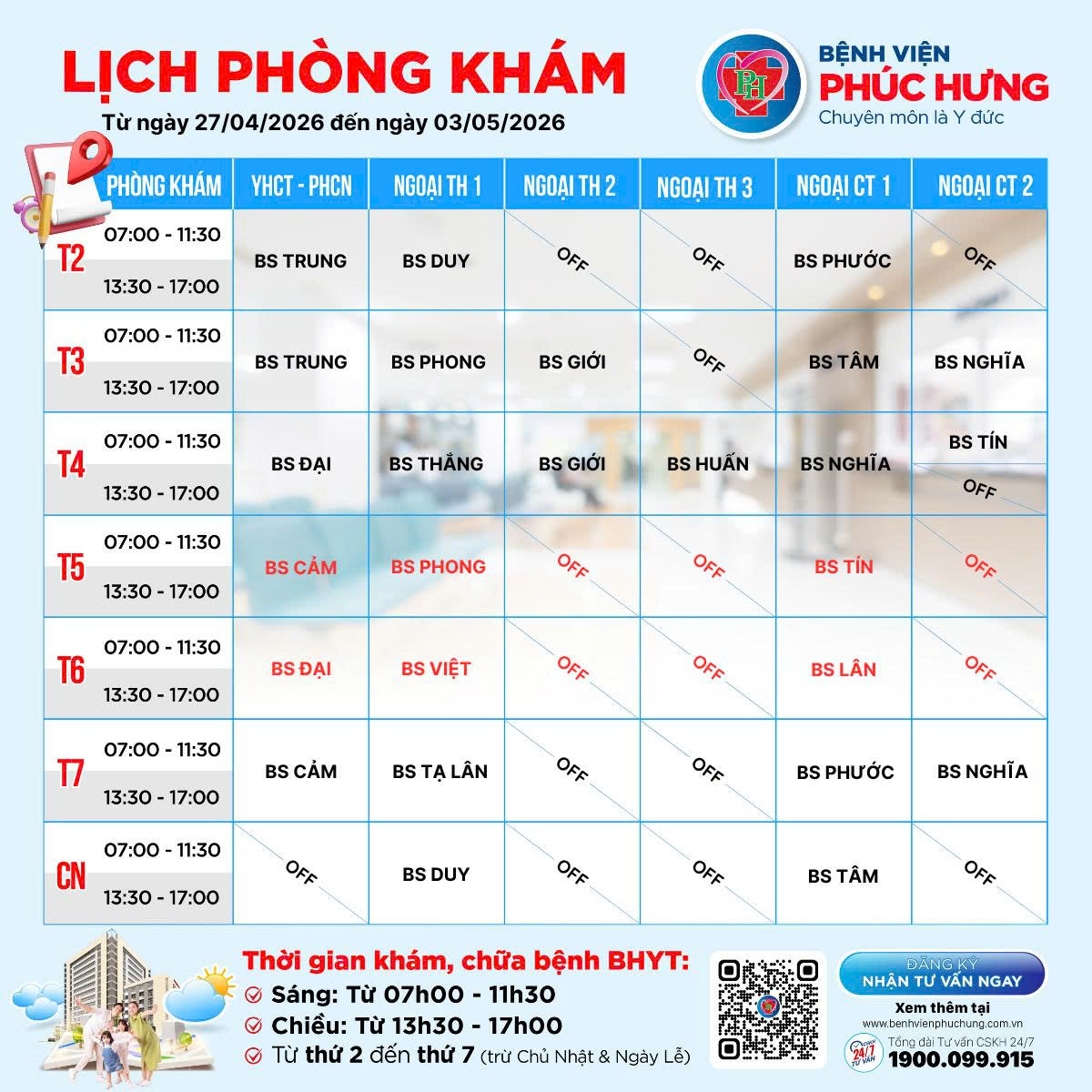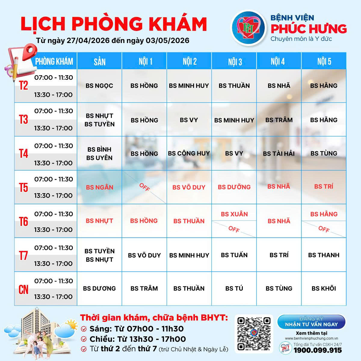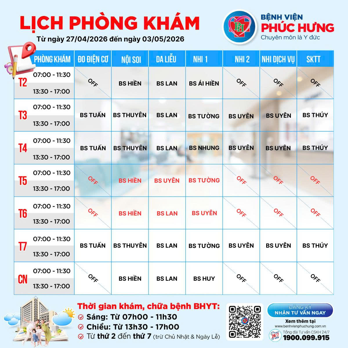 LỊCH PHÒNG KHÁM | 27/04 - 03/05